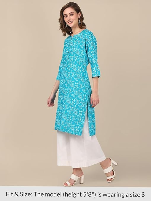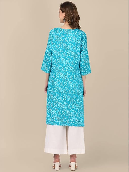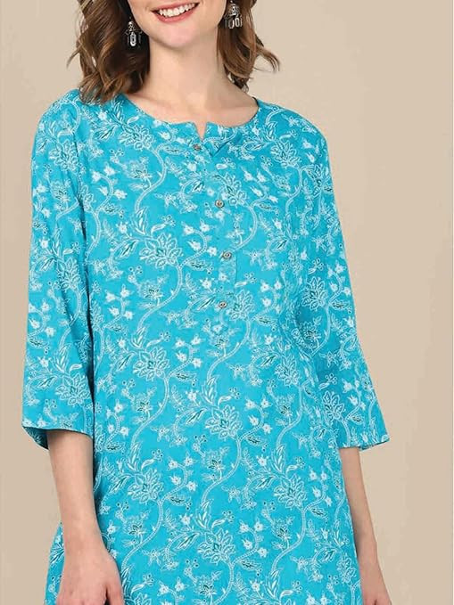 Colour: Turquoise || Fabric: Rayon Style: Straight || Neck: Round Neck Pattern: Printed || Pattern Type: Floral