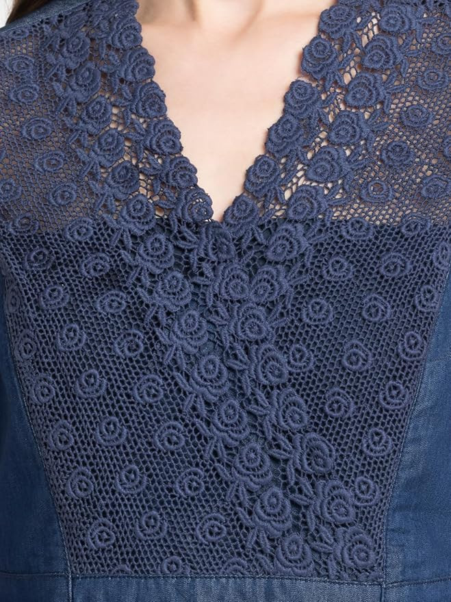 Blue v-neck short cap sleeves denim top has lace embroidery on front and overlap detail The flattering V-neckline adds a touch of sophistication, while the short cap sleeves provide just the right amount of coverage for warmer days. Whether paired with your favorite jeans for a casual outing or dressed up with a skirt for a night on the town, this top is sure to turn heads wherever you go.