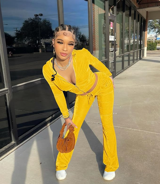 2 Piece Outfit:Solid color elastic sportswear set for women includes zipper hooded crop top with elastic sleeves and waistband, elastic long pants with adjustable drawstring, which makes you relax and feel comfortable to wear. Long sleeve elastic velvet hoodie