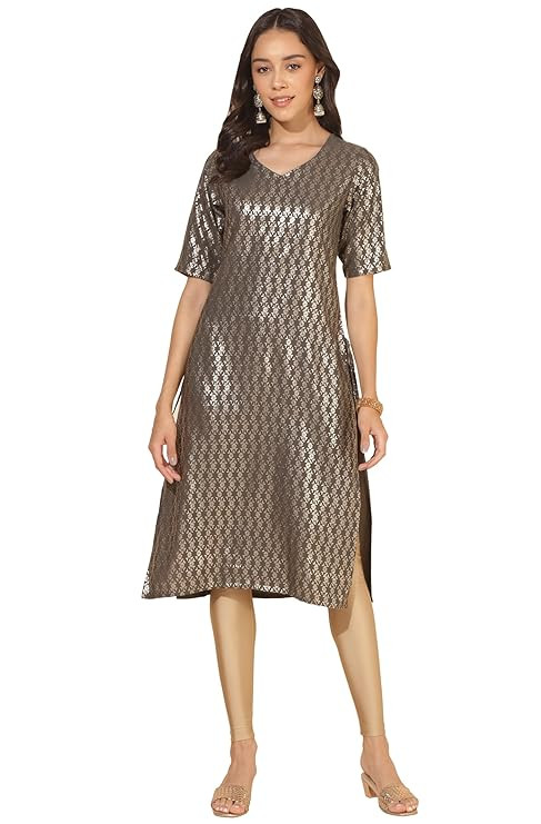 Women's Grey Crepe Foil Printed Straight Kurta