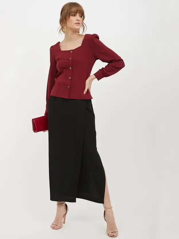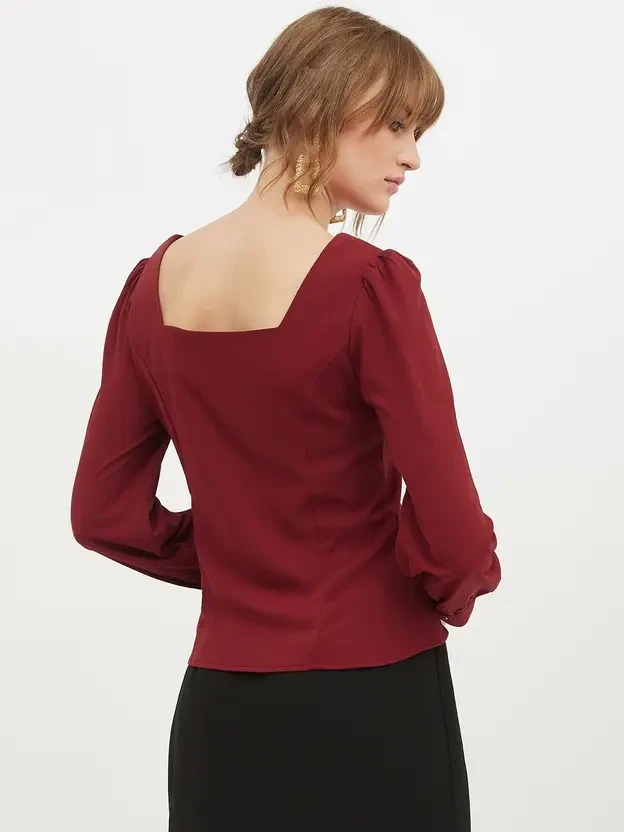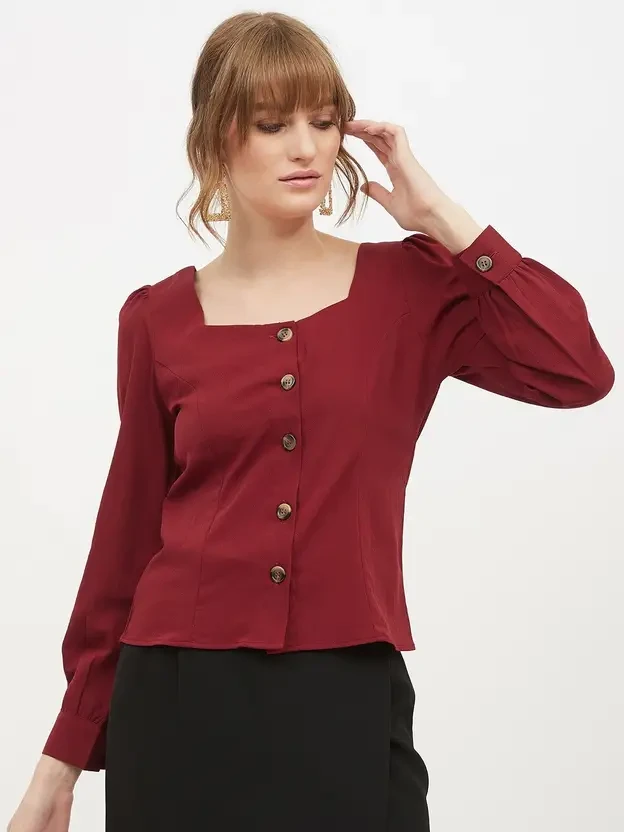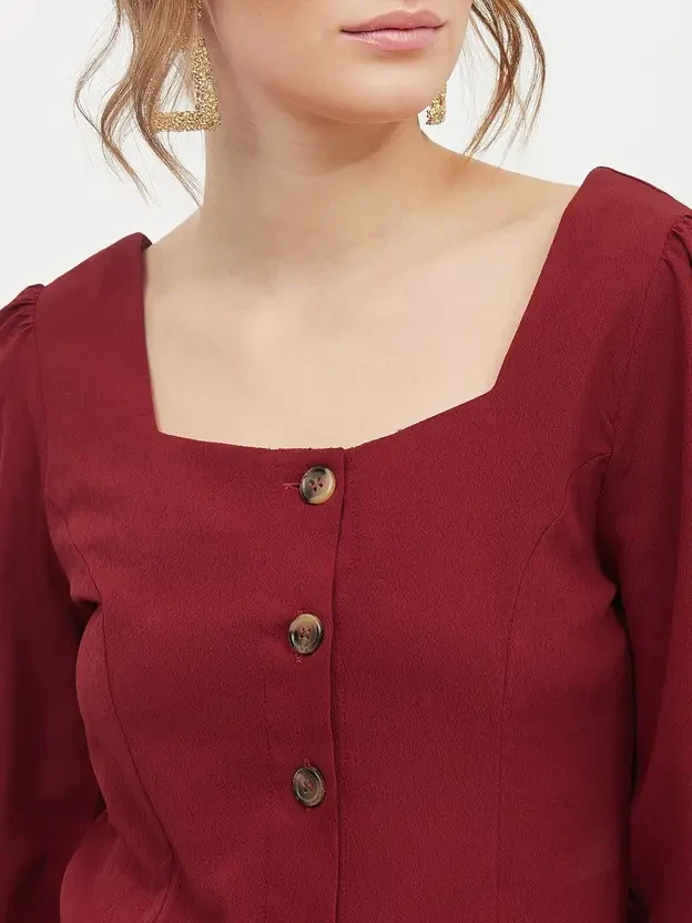 Maroon Solid woven regular Top, has a Square Neck With, Full Sleeve
