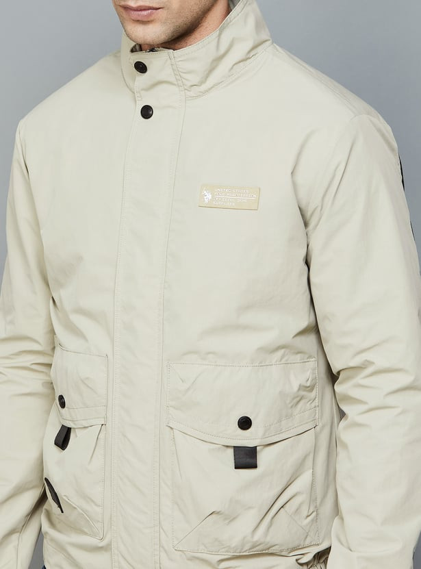 Look effortlessly stylish this winter season with this bomber jacket, designed with a printed surface, zip closure, pockets, and full sleeves. This jacket is also comprised of a button and Velcro closure that will keep you in sync with the fashion trend. The stand collar and shoulder straps keep the jacket at bay.