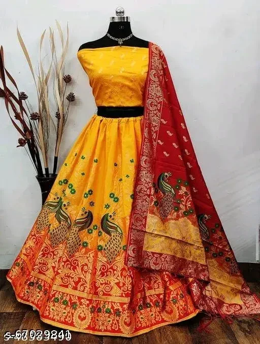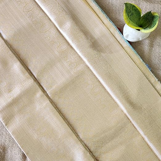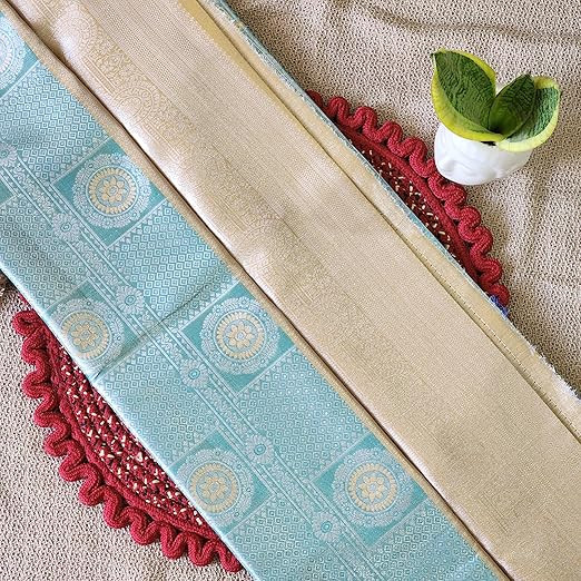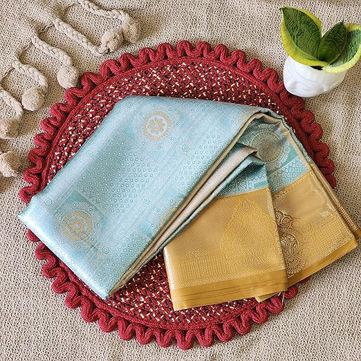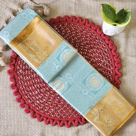 Material: Premium tissue silk with a smooth, lustrous finish. Design: Soft greenish-blue base complemented by broad gold zari borders, exuding elegance and sophistication. Craftsmanship: Intricate gold zari work that adds richness and depth to the saree. Occasions: Ideal for weddings, festivals, and special celebrations where you wish to shine. Comfort & Elegance: Lightweight tissue silk ensures comfort while radiating timeless beauty. Unique Color Combination: A serene blend of greenish-blue and shimmering gold, creating a sophisticated and royal appeal.