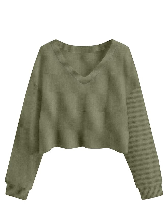 CAVDIA Women's Cotton (Waffle) 2024 Summer Winter Spring Long Sleeve V-Neck Casual Workout Crop Tops for Women Gym Running Loose Tunic Tops