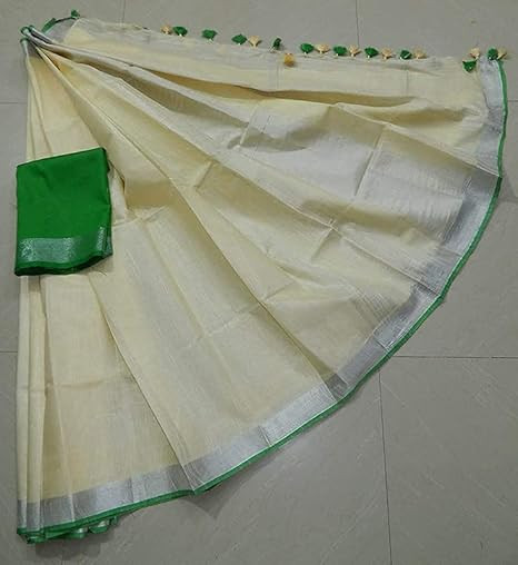 Saree Material : Cotton Linen Blend ; Design : Contrast Blouse Piece with Zari Border & Pallu Saree Length : 6.4 mts (0.9 mtr Blouse piece attached with saree) Disclaimer : Used Products are unchangeable & non-Refundable
