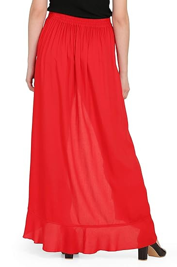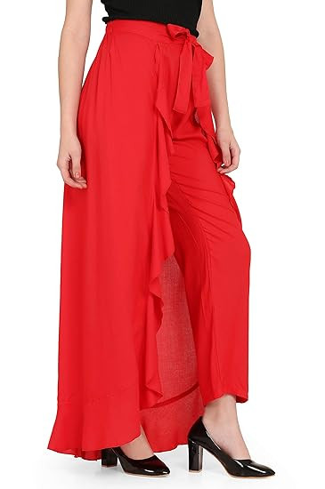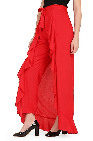 Material: Rayon Soft, breathable fabric, comfortable to wear. Design : Rayon tie-waist ruffle palazzo pants,Scollop flare skirt,Loose pants skirt,Bow-tie ribbon,Wide leg trousers Features : Fit and Flare Style, Solid, Belted, High Waist, Splits, Wrap. Occasion: Suitable for casual daily wear, school, office, shopping, dating, beach, party, vacation ,night club,cocktail party, etc. Great for spring and summer.