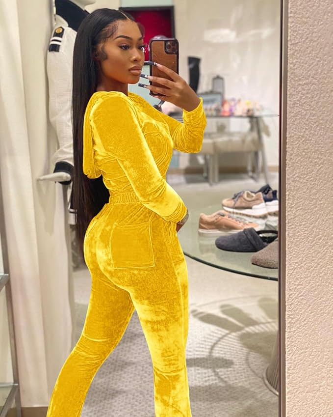 2 Piece Outfit:Solid color elastic sportswear set for women includes zipper hooded crop top with elastic sleeves and waistband, elastic long pants with adjustable drawstring, which makes you relax and feel comfortable to wear. Long sleeve elastic velvet hoodie